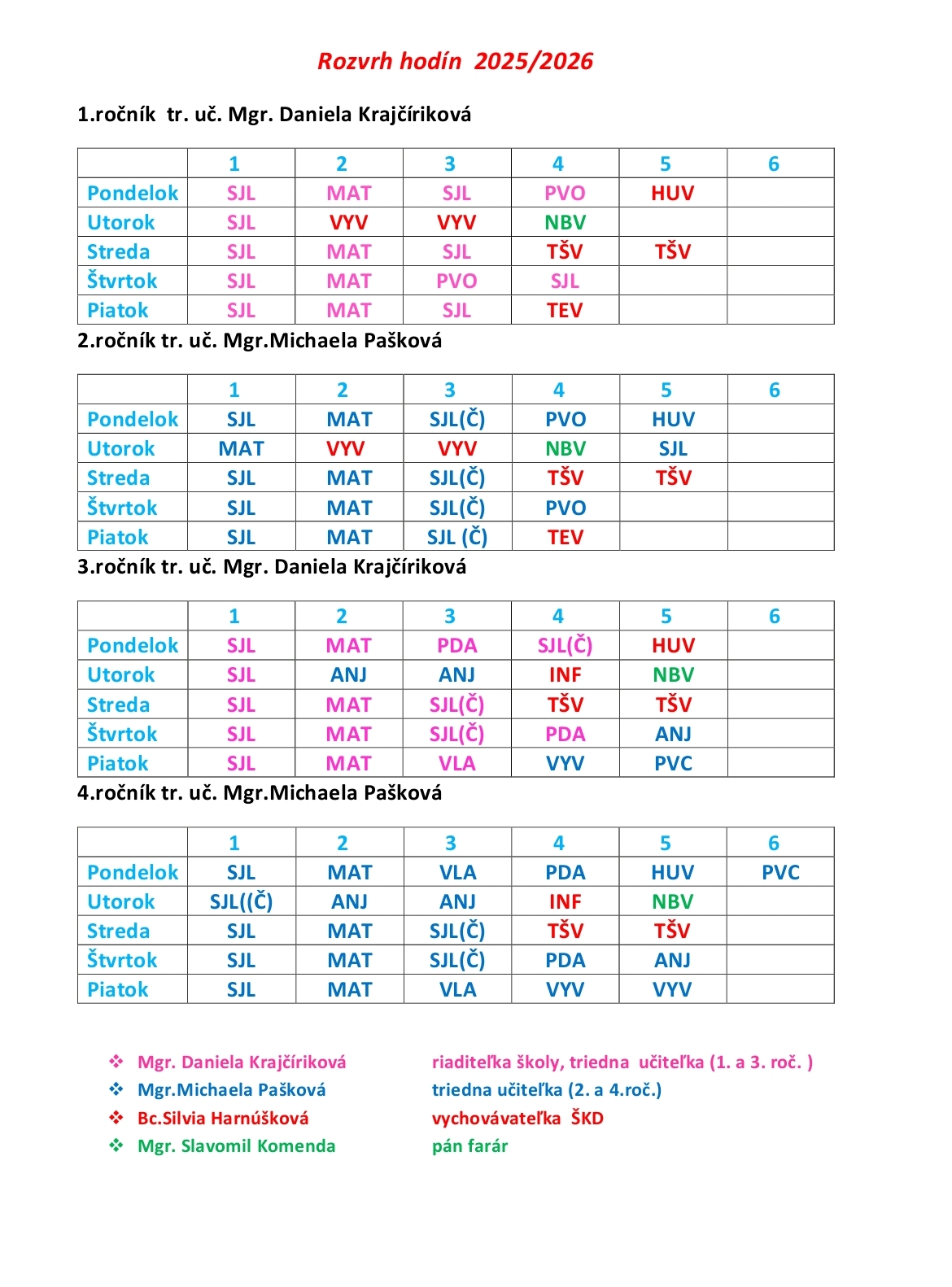 Harmonogram vyučovacích hodín, prestávok a prázdniny na školský rok 2025/2026